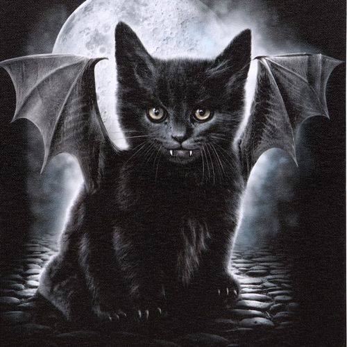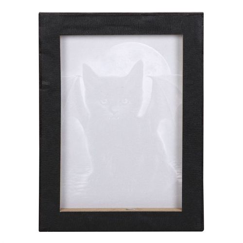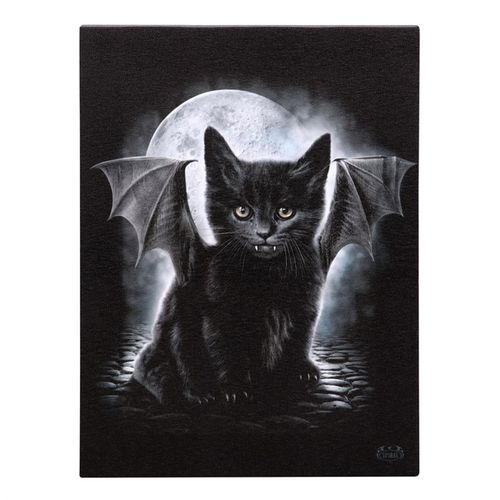 This dark and alluring canvas plaque features licensed artwork from Spiral Direct. 'Bat Cat' depicts an adorable vampire kitten with tiny fangs and bat wings and will elevate any gothic decor. 19x25cm.