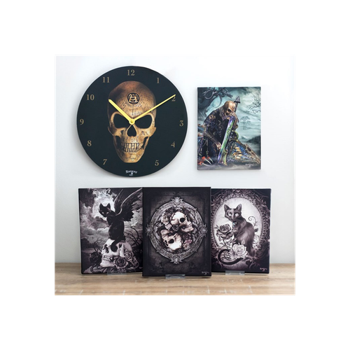 This small canvas plaque features the detailed 'Dioscuri' artwork by the popular Alchemy Gothic of London. A pair of fanged skulls are wrapped in roses and thorns in this greyscale piece. 19x25cm. The digital watermark will not appear in the print design. Product Dimensions: H25cm x W19cm x D1.5cm Packaged Dimensions: H25cm x W19cm x D1.5cm
