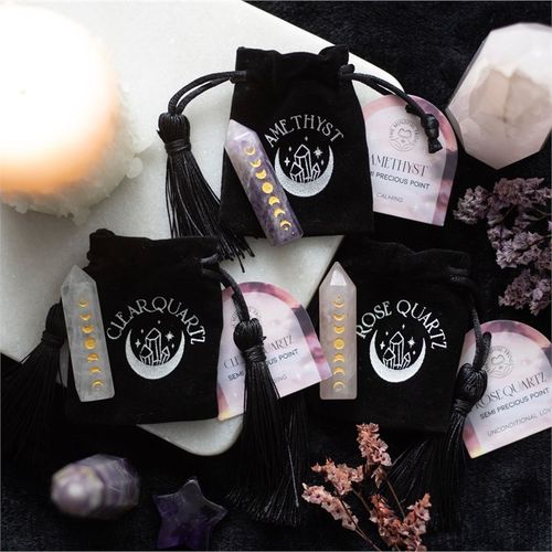 This beautiful amethyst crystal point is perfect in size for travel altars, desk decor or taking on the go for extra protection. Features a gold-tone moon phase engraving and comes with a matching drawstring bag for storage and safe-keeping. Product Dimensions: H5cm x W1.2cm x D1.1cm Packaged Dimensions: H8cm x W5.5cm x D1.4cm