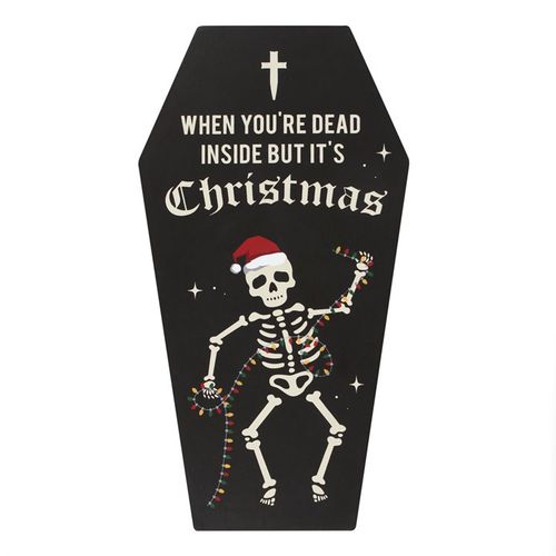 A fun and unusual alternative to standard Christmas decor this coffin-shaped wall plaque features a festive skeleton wrapped in a string of fairy lights with the text 'When you're dead inside, but it's Christmas' This gothic take on Christmas is perfect for the dark and edgy. Product Dimensions: H30cm x W16cm x D1.1cm Packaged Dimensions: H30cm x W16cm x D1.1cm