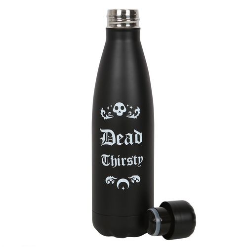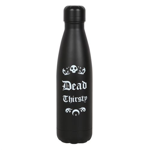 This metal water bottle features the text ''Dead Thirsty"" in white gothic themed text which stands out boldly against the black bottle. The bottle features a screw on cap to prevent any spillages. Hand wash only. 500ml capacity. Product Dimensions: H26.5cm x W7cm x D7cm Packaged Dimensions: H26.7cm x W7.3cm x D7.1cm
