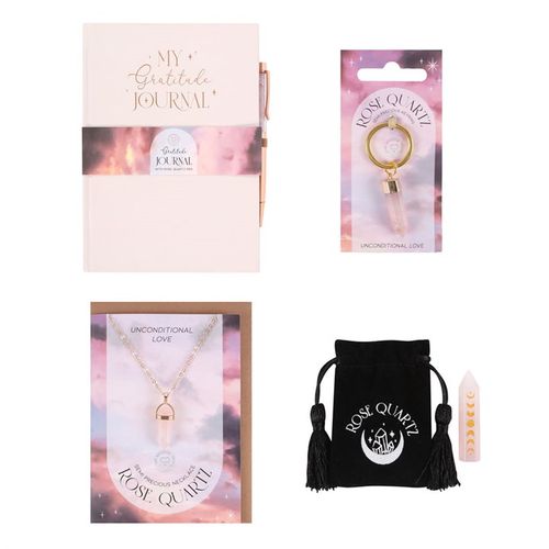 This new Gratitude set comes beautifully presented in a recyclable box with eco-friendly shredded paper filling. Arrives ready to gift for any occasion. Includes: A5 Gratitude Journal with Rose Quartz Pen, Rose Quartz Moon Phase Crystal Point , Rose Quartz Crystal Necklace Card and a Semi Precious Crystal Keyring. Product Dimensions: H8cm x W27cm x D21.5cm Packaged Dimensions: H8cm x W27cm x D21.5cm