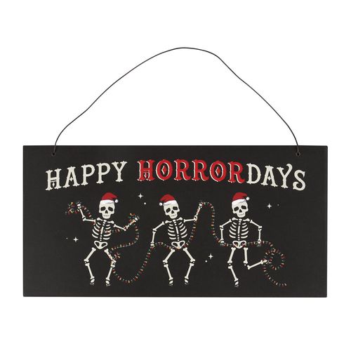 A fun and unusual alternative to standard Christmas decor this 'Happy Horrordays' hanging sign features a trio of dancing skeletons with a string of fairy lights. This gothic take on Christmas is perfect for the dark and edgy.Packaged Dimensions: H10cm x W20cm x D1cm