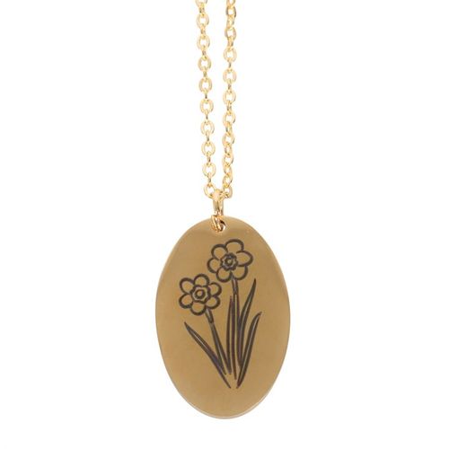 This lovely greeting card features a timeless wildflower design and holds a gold-tone necklace adorned with the recipient's birth flower, making it a thoughtful surprise for birthdays, Mother's Day, milestone moments and more. Symbolising hope, prosperity and renewal, the daffodil is a meaningful token for those born in the month of March. Includes engraved flower charm on a 22cm nickel-free chain. Card left blank inside. Envelope included.