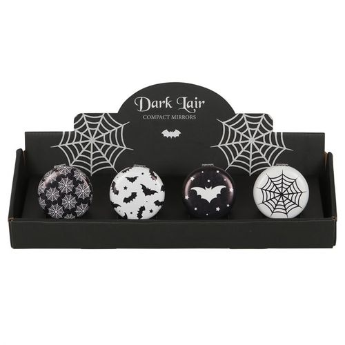 This display of spooky compact mirrors includes 12 mirrors with spider and bat-inspired designs. A great alternative gift with a gothic twist. Sold as a set of 12, 3 of each design, in a matching countertop display.