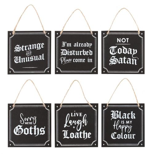 This collection of 12 gothic-themed mini signs are crafted from durable MDF. Featuring comical phrases making them perfect for adding a touch of dark elegance to home decor. Includes light brown rope for easy hanging and two of each design. Phrases include: x2 'Strange as usual' x2 'I'm already disturbed. Please come in' x2 'Not today, Satan' x2 'Sorry, we're goths' x2 'Live, laugh, loathe' x2 'Black is my happy colour'
