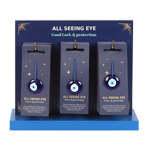 This stunning display includes 24 x All Seeing Eye glass charms which are perfect gifts for loved ones to offer them protection and good luck wherever they go. Also known as the Evil Eye this talisman is a symbol of luck and is believed to deflect misfortune. Each charm is presented on a blue card along with the meaning. Exclusive to Something Different and part of the 'All Seeing Eye' collection.