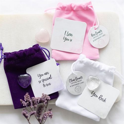 This stunning set of 24 Lucky Crystal Hearts are elegantly presented in a matching display box. The amethyst crystal heart promotes clarity, protection and the cleansing of negative energies and includes an informational "You are so special to me" sentiment card. The clear quartz lucky crystal heart promotes clarity, peace and purification of negative energies and includes an informational "You rock" sentiment card. The lucky rose quartz crystal heart promotes love, friendship and confidence and includes an informational "I love you x" sentiment card. These charming crystal hearts make a meaningful token of inspiration and empowerment for anyone in need for some extra positivity. The set include x8 of each crystal with matching velvet drawstring bags.