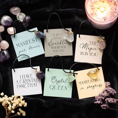 This display of 24 magical signs features 6 unique phrases for promoting positivity and inner confidence. Each sign is accented by a matching raw crystal charm to amplify intentions and enhance your inner magic. Designs include: 'I have a crystal for that' with amethyst, 'The magic is in you' with rose quartz, 'Manifest your dreams' with sodalite, 'Leave a little sparkle wherever you go' with clear quartz, 'Manifesting in progress' with citrine, and 'Crystal queen' with green aventurine. Sold as a set of 24 signs on a matching countertop display.