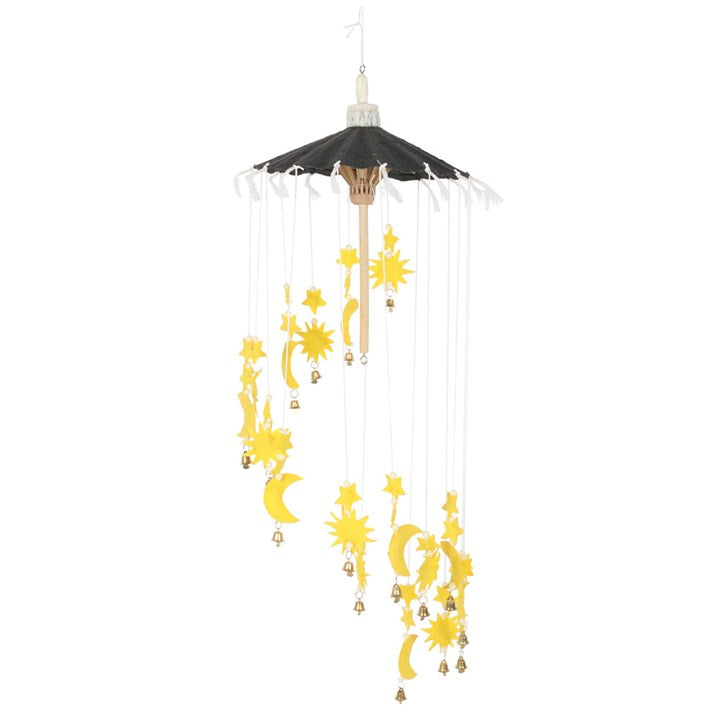 This SAA mobile features a celestial sun, star and moon design with gold bell accents. Ethically sourced and created from SAA paper traditionally made by hand from the bark of mulberry bushes. Product Dimensions: H66cm x W26cm x D26cm Packaged Dimensions: H26.5cm x W23cm x D3.5cm