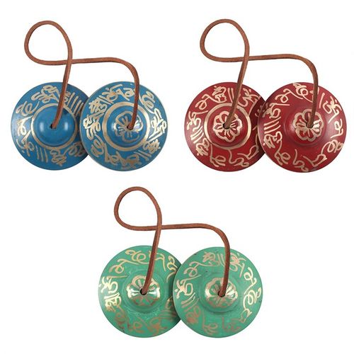 Pair of traditional style Tibetan tingsas in a material pouch bag. Please note that colours and patterns of the Tingshas may vary. Product Dimensions: H2cm x W6.7cm x D6.7cm Packaged Dimensions: H6.5cm x W8.5cm x D8.5cm